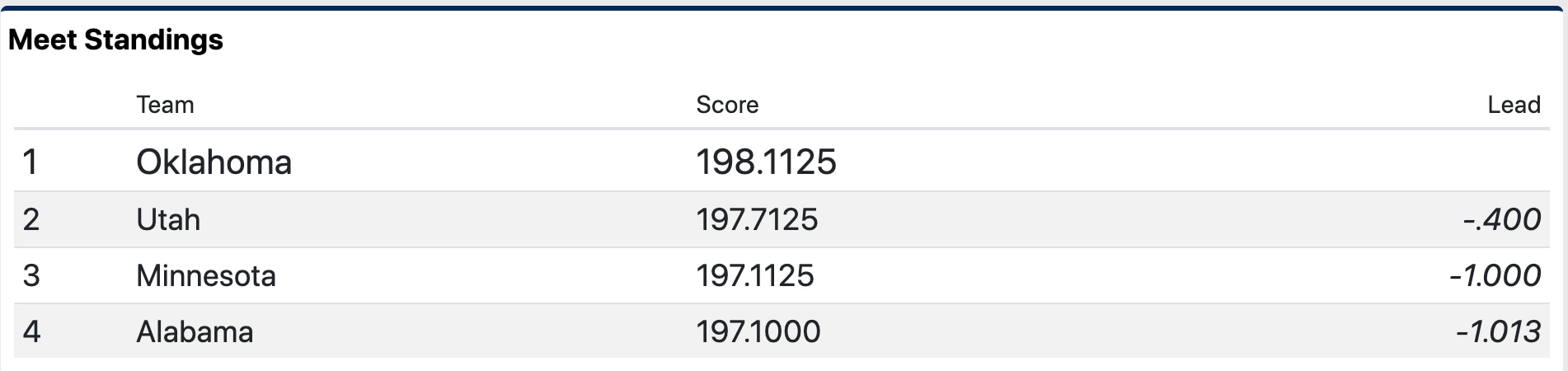 Our first of two semifinals is underway. No. 1 Oklahoma, No. 4 Utah, No. 5 Alabama and No. 8 Minnesota are competing for two spots in the team final on Saturday. The individual champions will also be crowned today.