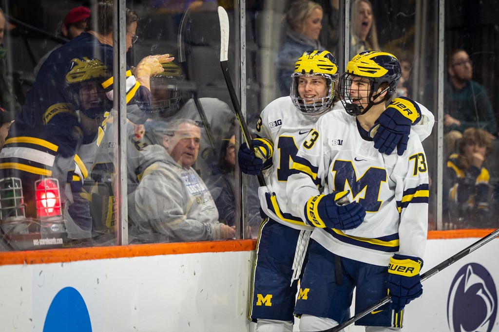 Michigan’s offense struggled early on, but found itself early in the second period when Jimmy Lambert converted on a chance from right in front of the Denver net to tie the game, 1-1.