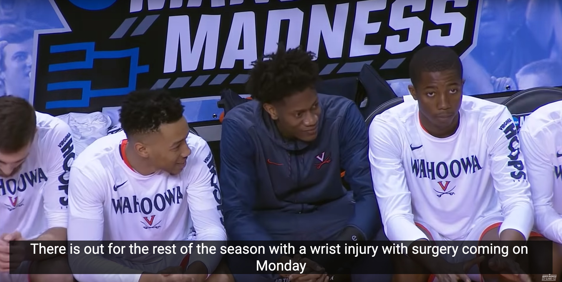 "One story we'll be discussing," CBS' Jim Nantz said of Virginia at the start of the broadcast, "without De'Andre Hunter, their valuable sixth man, the Sixth Man of the Year in the ACC out — there he is — out for the rest of the season with a wrist injury, with surgery coming on Monday."