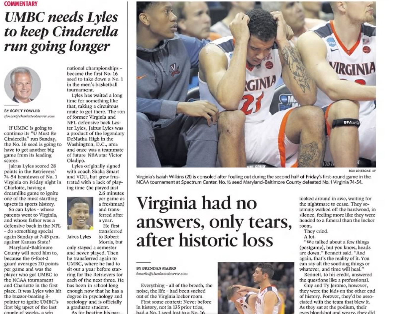 When the ball was tipped, UMBC point guard K.J. Maura, a senior listed at 5-foot-8 and 140 pounds who personified the underdog spirit of the Retrievers, stood on the far right edge of the March Madness logo at midcourt, with his left foot on the final "S" in "Madness." With the game being played in Charlotte, the announcing team made several comparisons to Muggsy Bogues, the 5-foot-3 former NBA player who spent a decade with the Hornets.