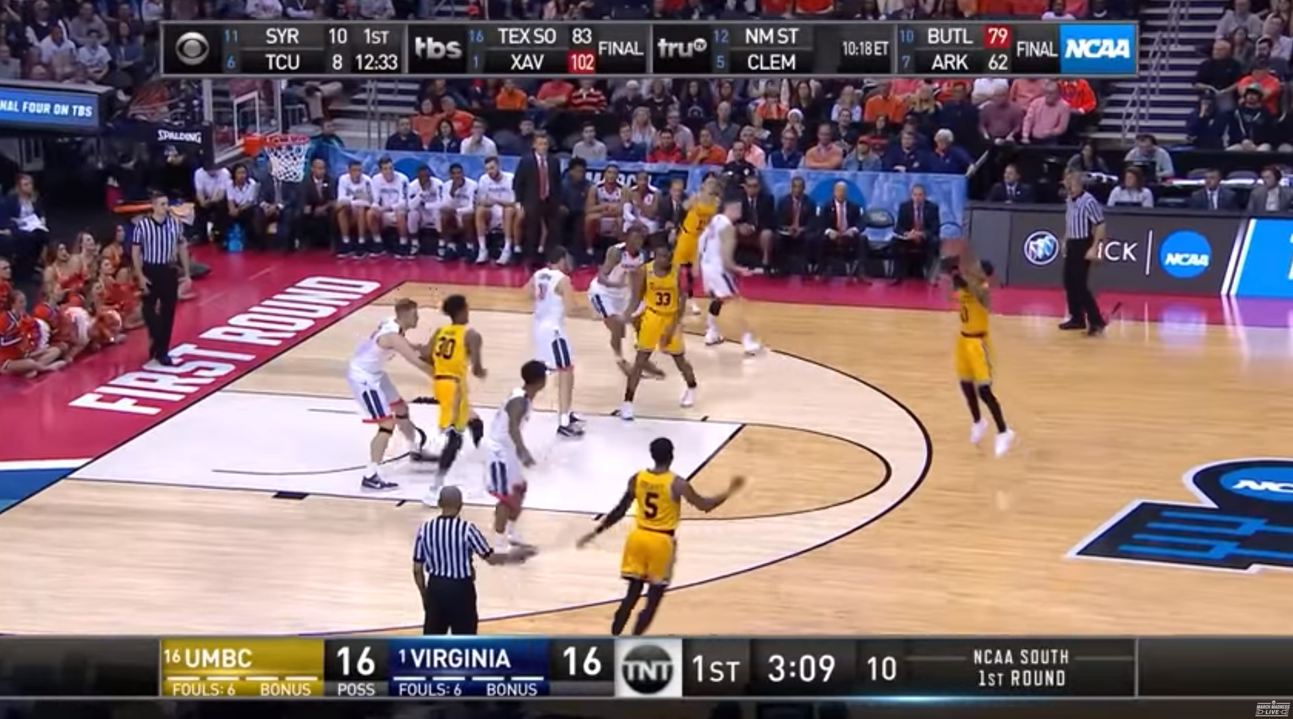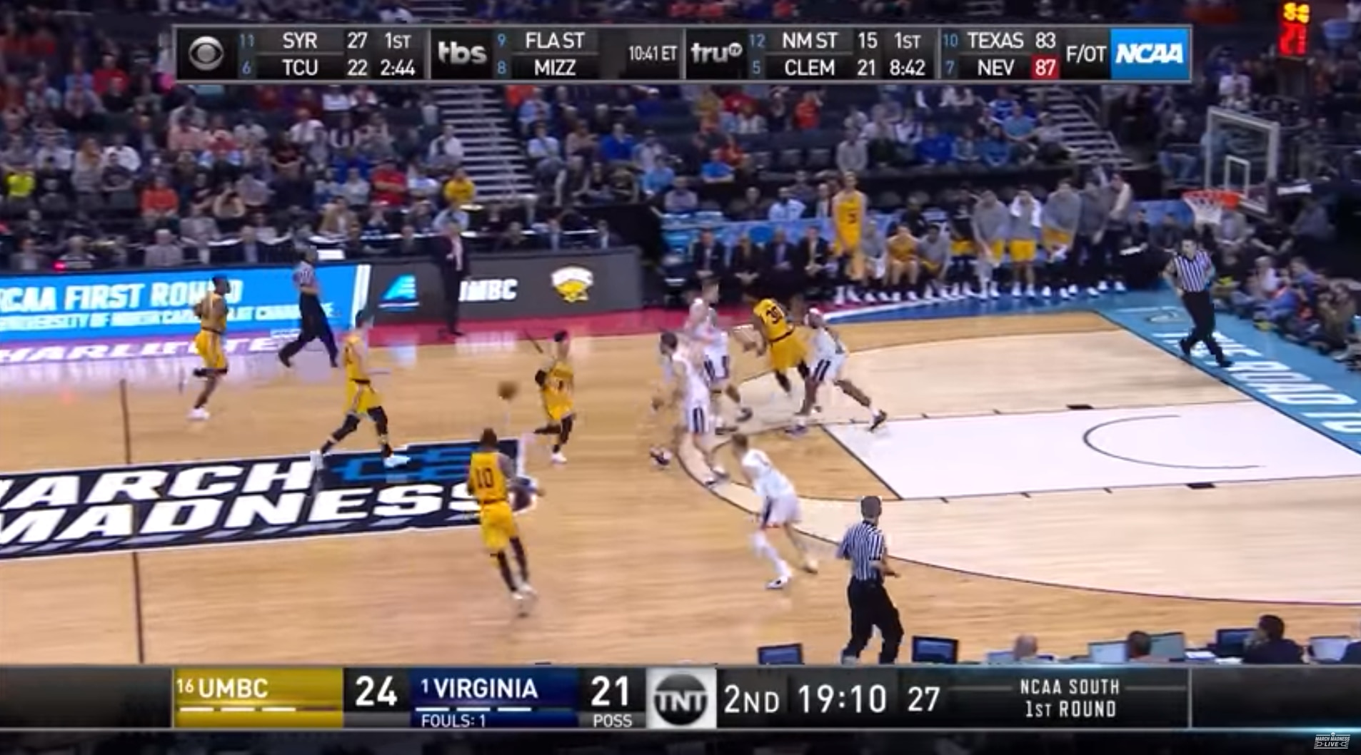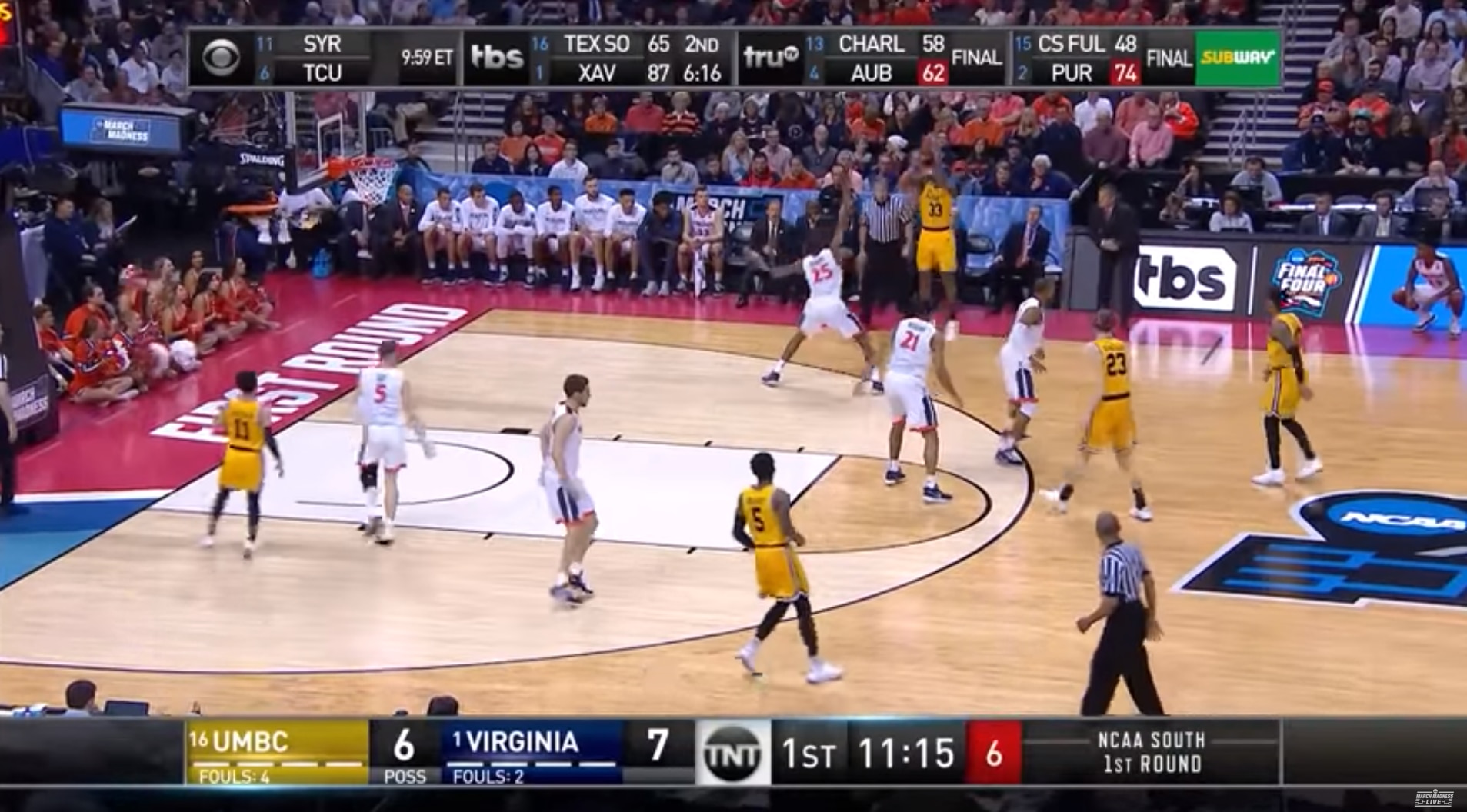 Curran, wearing jersey No. 23 at the left elbow in the screenshot below, found Jourdan Grant wide open at the top of the key for a straightaway 3-pointer, as one Retriever reserve found another to end what was approaching six minutes without UMBC seeing a non-free throw attempt go in the bucket. "You need second possessions against Virginia," Raftery said. "You've got to work the glass cause any long rebounds, advantage to the offense."