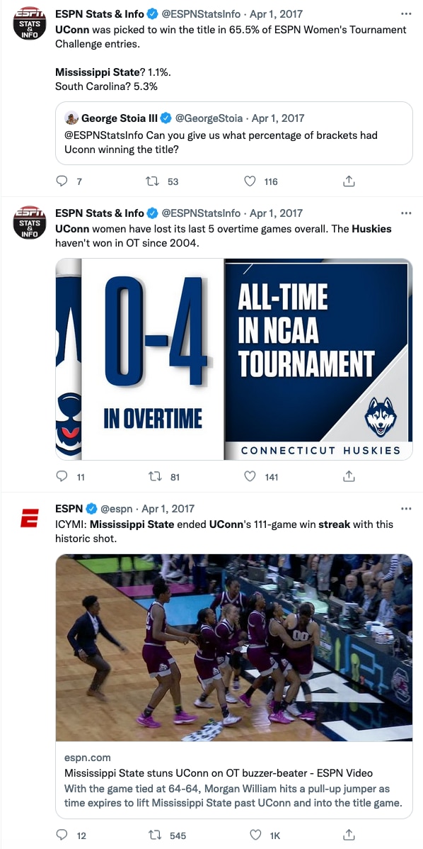 If you were on Twitter on March 31, 2017 and April Fool's Day, here's what your Twitter timeline may have looked like, as the sports world reacted to Mississippi State's epic buzzer-beater and historic upset.