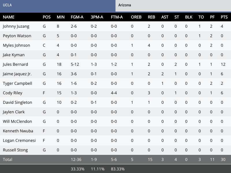 Johnny Juzang has six points this half along with a few other of his teammates getting a couple. The Bruins will have to space out and get points in transition if they want to keep things close.