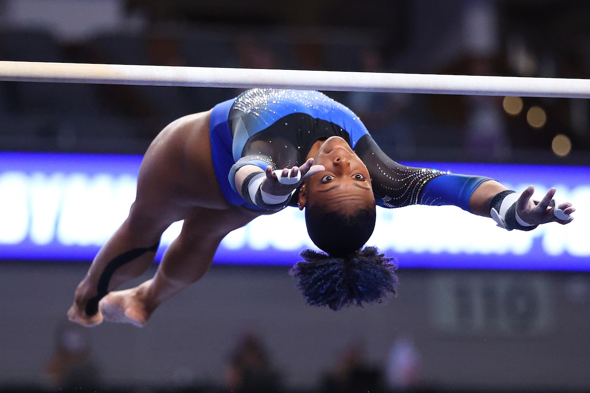 Florida's Trinity Thomas won the all-around title after scoring a perfect 10 on floor. After suffering an injury in 2021, Thomas has been better than ever this season. She completed the season slam at the regionals after posting four perfect 10's and a 39.9 all-around score. In the semifinals, her 39.8125 was enough to secure the all-around title, and on top of that, she was crowned champion on floor and on the uneven bars. Right before her bar routine, there was a technical cable difficulty with the uneven bars that delayed her performance. You would think a delay like that would have affected her performance, but she instead stuck her landing and sent her teammates into a full-blown "perfect 10" chant. She scored just short of perfect, with a 9.9750.