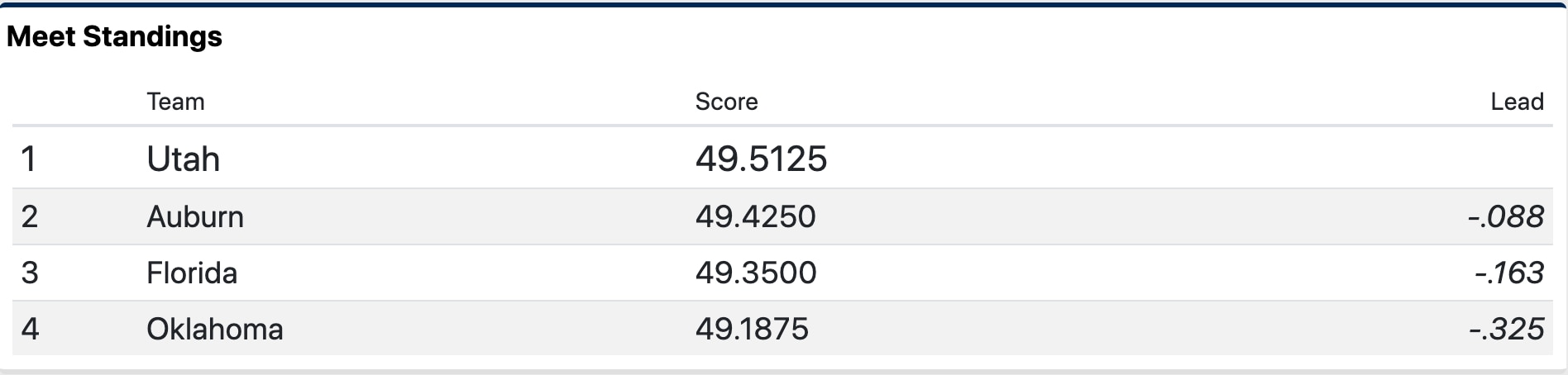 Utah remains in the lead though after Grace McCallum, Abby Paulson and Sydney Solaski each scored 9.9 or above on floor. Solaski had a clutch anchor performance, scoring a 9.9125.
