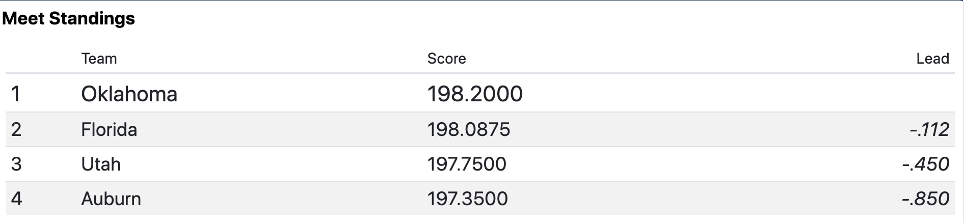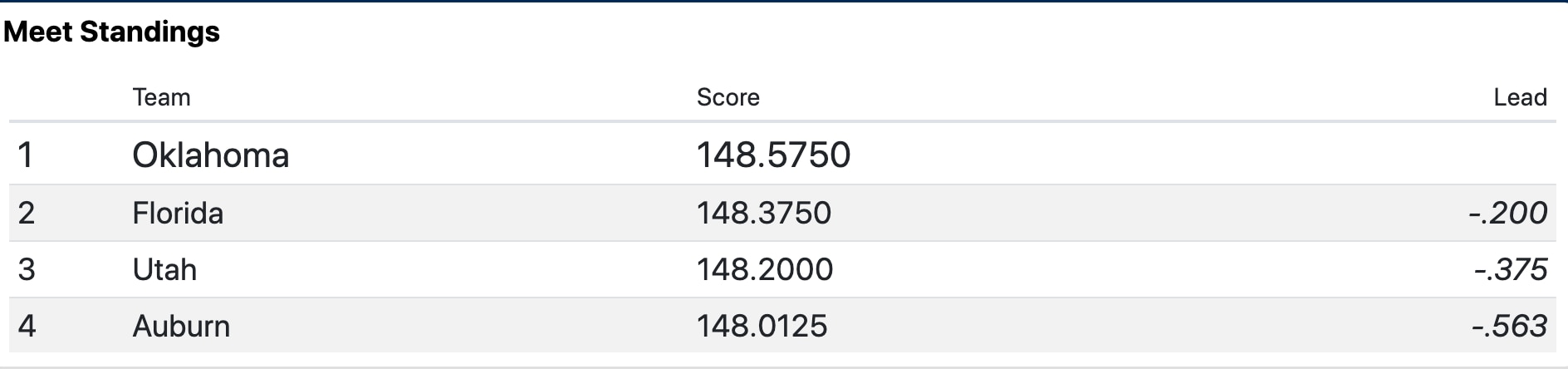 The Gators are in third after the first rotation on vault. Trinity Thomas came through, per usual, with a high 9.9875, which is the second highest vault ever for a Gator in team final. But, Leanne Wong was the only other Gator to score above a 9.9. Oklahoma is in fourth after a slow start on floor. No Sooner scored above a 9.9. Here is the full score breakdown β¬οΈ