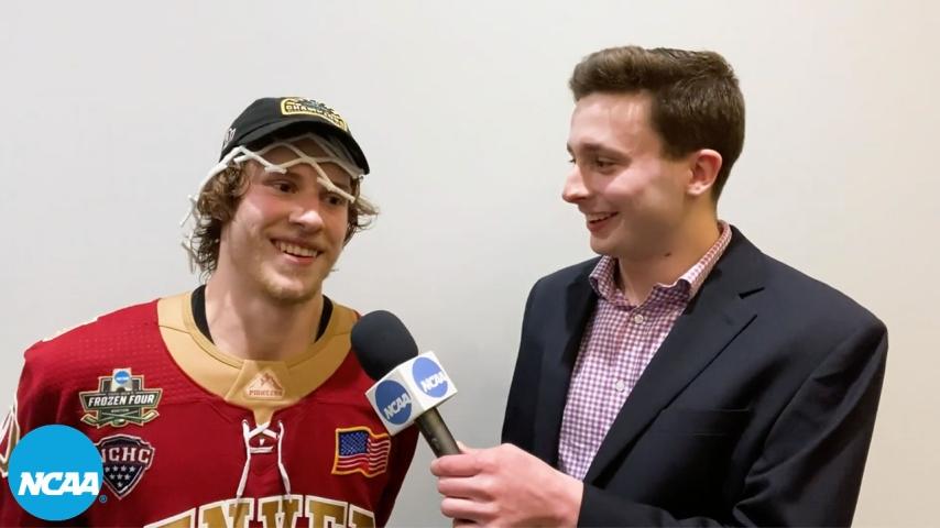 Denver's Mike Benning talks after national championship victory