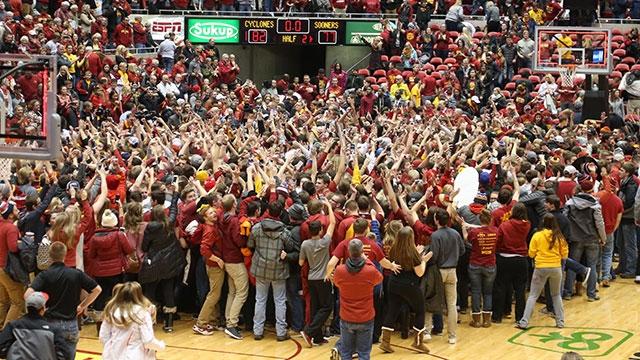 Iowa State fans storm the court after the Cyclones defeated No. 1 Oklahoma.