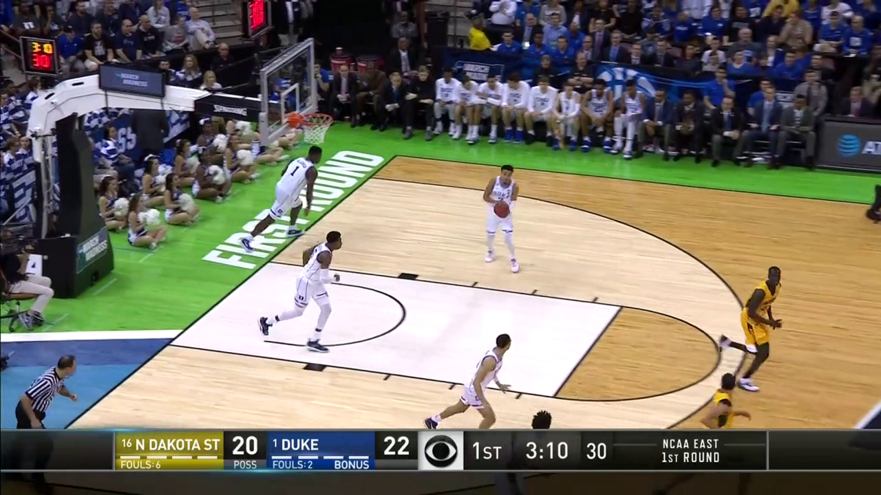 This was a four-point game at halftime. North Dakota State was hanging with the Blue Devils, scoring at the same rate Duke was and getting the ball inside just enough. Vinnie Shahid had 13 points in the first half.
