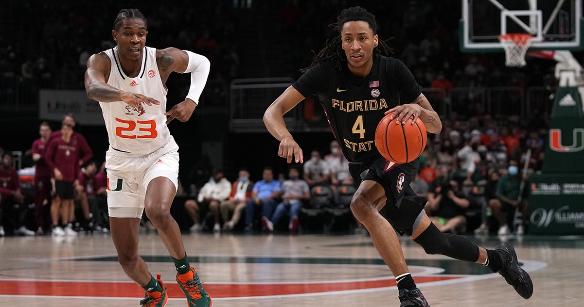 Florida State appeared to be on track to coast to a road win, leading by 24 points at halftime, 43-19, thanks to a last-second three from Wyatt Wilkes. Florida State still carried a double-digit lead with seven minutes to play, but in front of its home crowd, Miami roared back in the second half. Miami's Isaiah Wong scored nine consecutive of Miami's points, including a four-point play that cut Florida State's lead to 61-58 with 1:22 remaining. Wong's steal of Florida State's Caleb Mills led to a dunk from Sam Waardenburg, which cut the deficit to 61-60, and Miami was able to force a shot-clock turnover on Florida State's next possession, but Wong missed the potential game-winner and Florida State was able to escape with a road win.