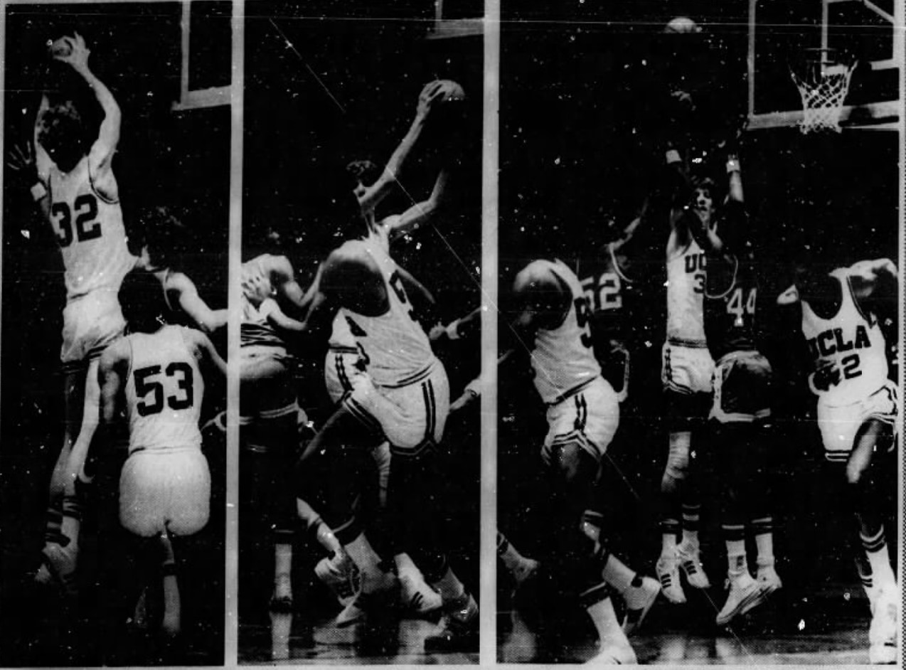 The following series of photographs in The Daily Herald (Provo, UT) show Walton's technique of grabbing a rebound, holding the ball high over his head and throwing a two-handed overhead pass to a teammate.