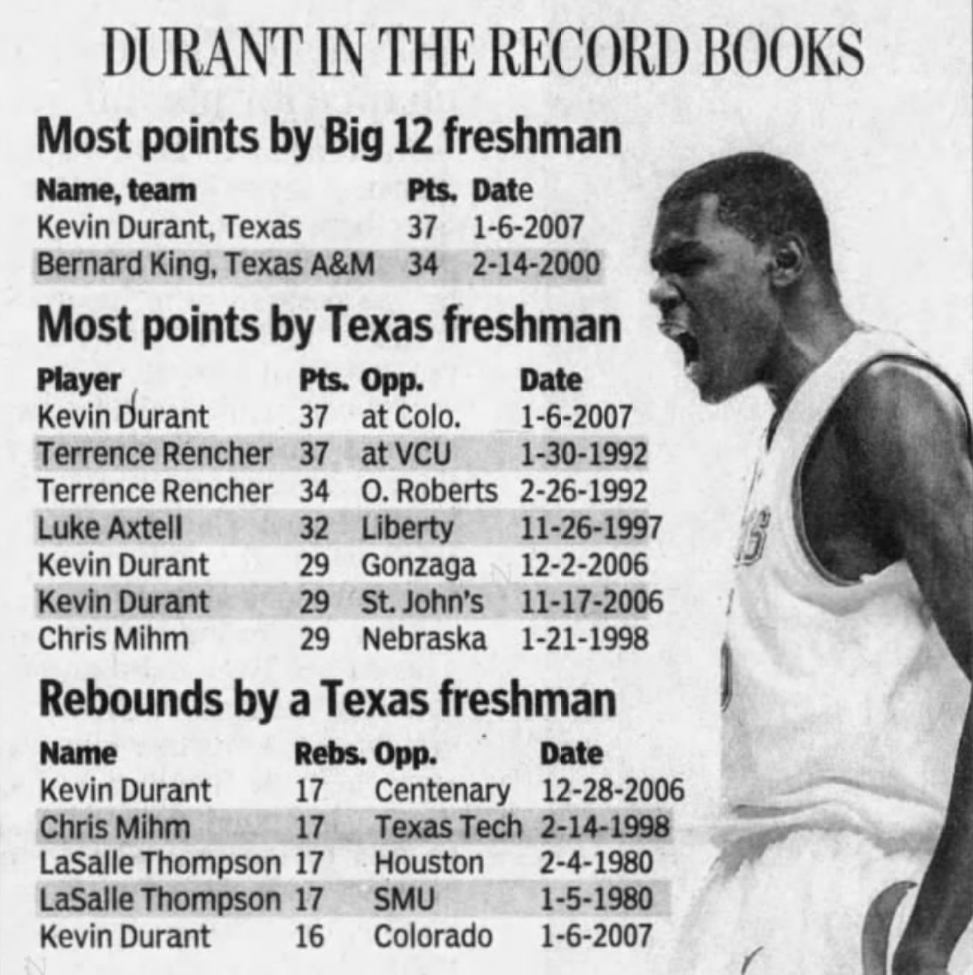 In 35 games in college, Durant scored in double figures in every single one. That's how good he was as a freshman. He broke the 20-point mark in each of his first seven games, so it was clear Texas had a rising star on its roster.