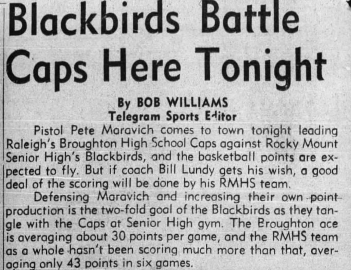 The first reference we were able to find to "Pistol" Pete Maravich came in the Rocky Mount Telegram in Rocky Mount, North Carolina on Jan. 12, 1965, when he was a junior in high school. A screenshot of that newspaper is below.