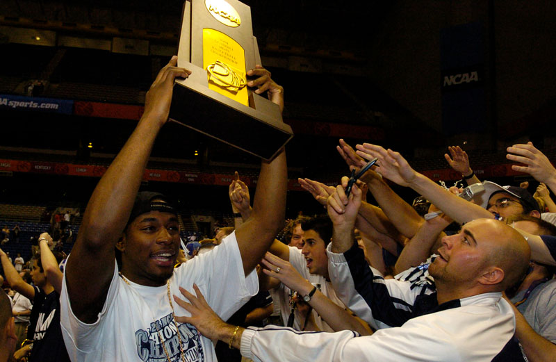 Rollie Massimino cuts the nets after Villanova, the only 8-seed ever to win in a 64-team tournament, shocked Georgetown.
