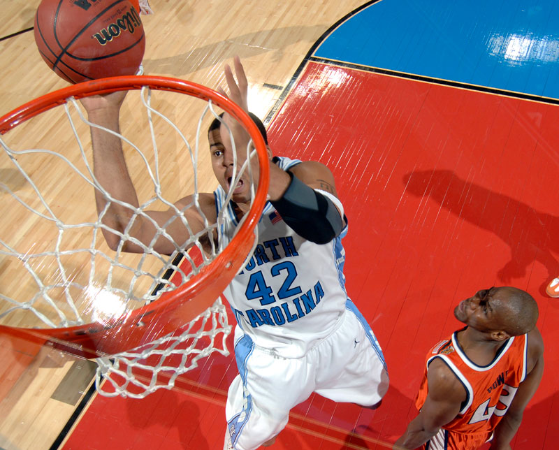 Ty Lawson waves to fans after cutting down the net following the championship game.