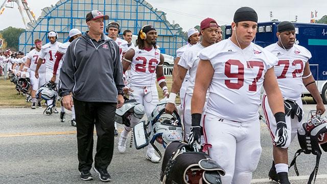 Henderson State teammates walk to their “road game” at Ouachita Baptist.