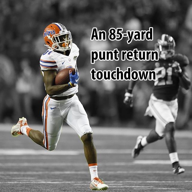 Florida took its first and only lead of the SEC Championship match with Alabama thanks to a nice punt return touchdown from Antonio Callaway. After a booming punt forced Callaway to receive the ball at the Florida 15-yard line, Callaway turned on the jets and stormed right up the center of the field for the 85-yard touchdown score. Not a single defender touched Callaway during his return, and the lightning-fast freshman wide out gave the Gators a 7-2 lead early in the second quarter.