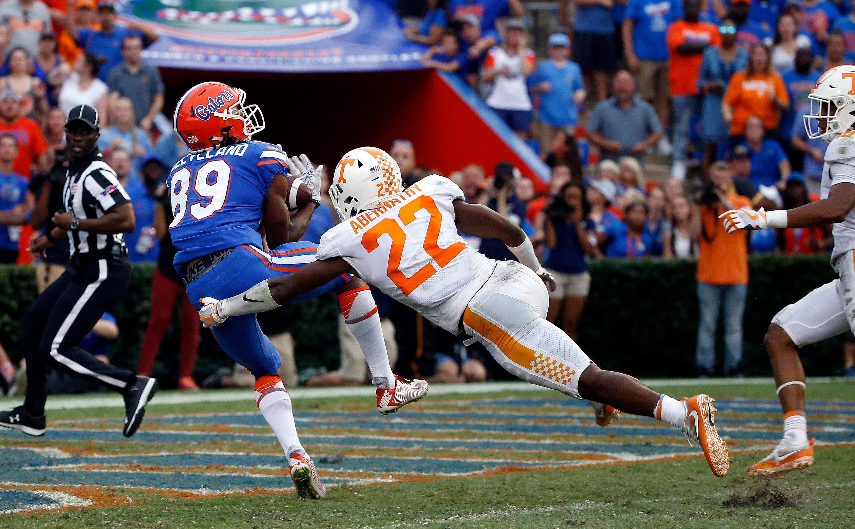 Franks was flushed to his right escaping the Vols' pass rush when he saw Tyrie Cleveland put his hand up behind the Tennessee defense. The redshirt freshman set his feet and unleashed a perfect strike that traveled over 63 yards in the air, landing perfectling in the arms of Cleveland with no time left to cap off a 26-20 win at Ben Hill Griffin Stadium.