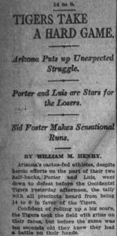 "Confident of rolling up a big score, the Tigers took the field with grins on their faces, but before the game was ten seconds old they knew they had a battle on their hands," Henry wrote. The headline of the story was "Tigers Take A Hard Game" and one of the subheadlines was "Arizona Puts up Unexpected Struggle."