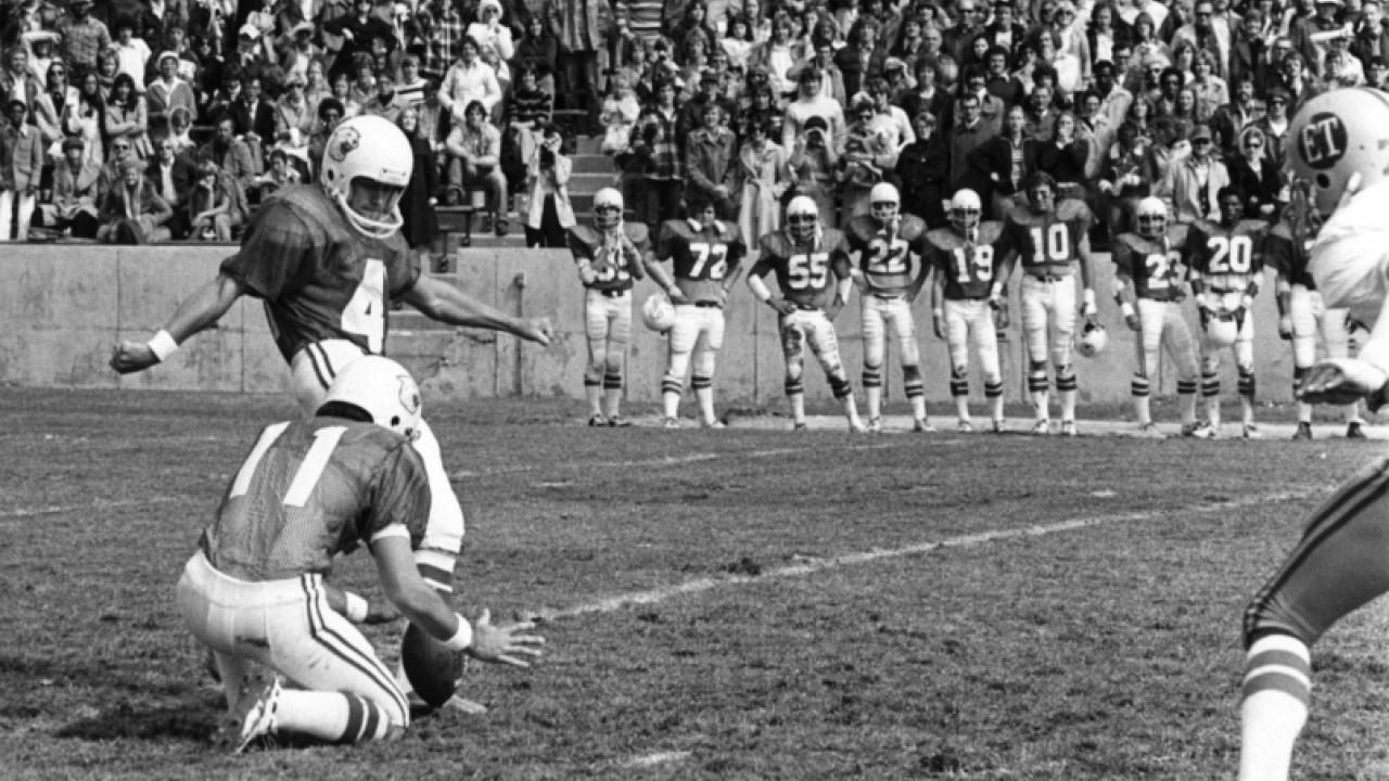 In hindsight, there was nothing pitiful about it. "I said, 'This little baby's going to fly,' and I kicked off and it went through the uprights and over the chain length fence of the athletic dorm."