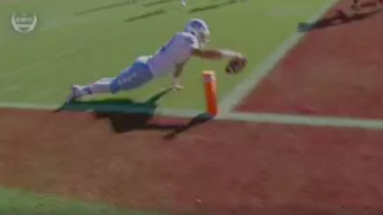 The topper here is Trubisky's presence of mind after he takes off on the run. As he dives for the goal line, the junior quarterback still has the presence of mind to use his off hand to keep from making contact with the ground before breaking the plane of the endzone with the football.