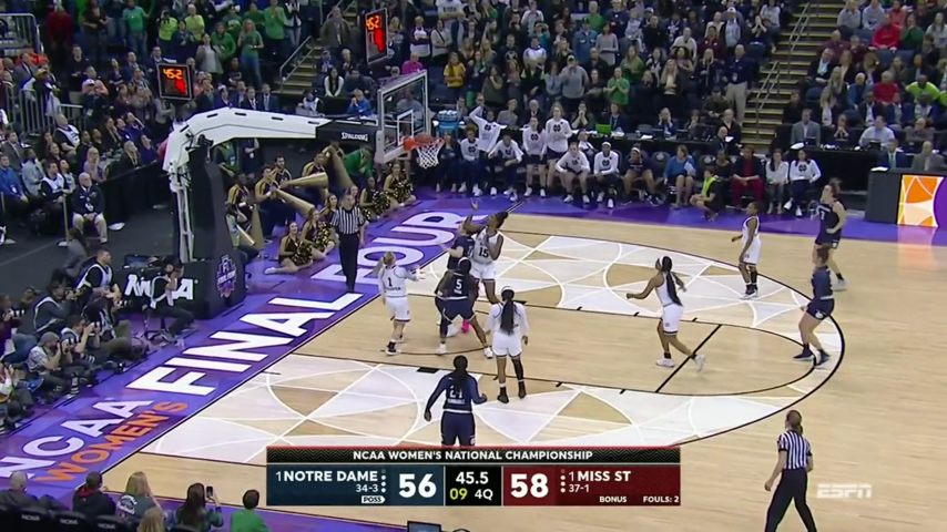 Notre Dame stepped up its game in the second half, but still had a deficit to come back from. The Irish went on a 16-1 run to close the third quarter at a 41-41 tie. After back-and-fourth play, Notre Dame and Mississippi State found themselves tied once more, at 58-58, with just 40.1 second left. Then again, with the help of Arike Ogunbowale, they pulled off the win. A last-second buzzer-beater completed the 15-point comeback to mark Notre Dame's first national championship since 2001.