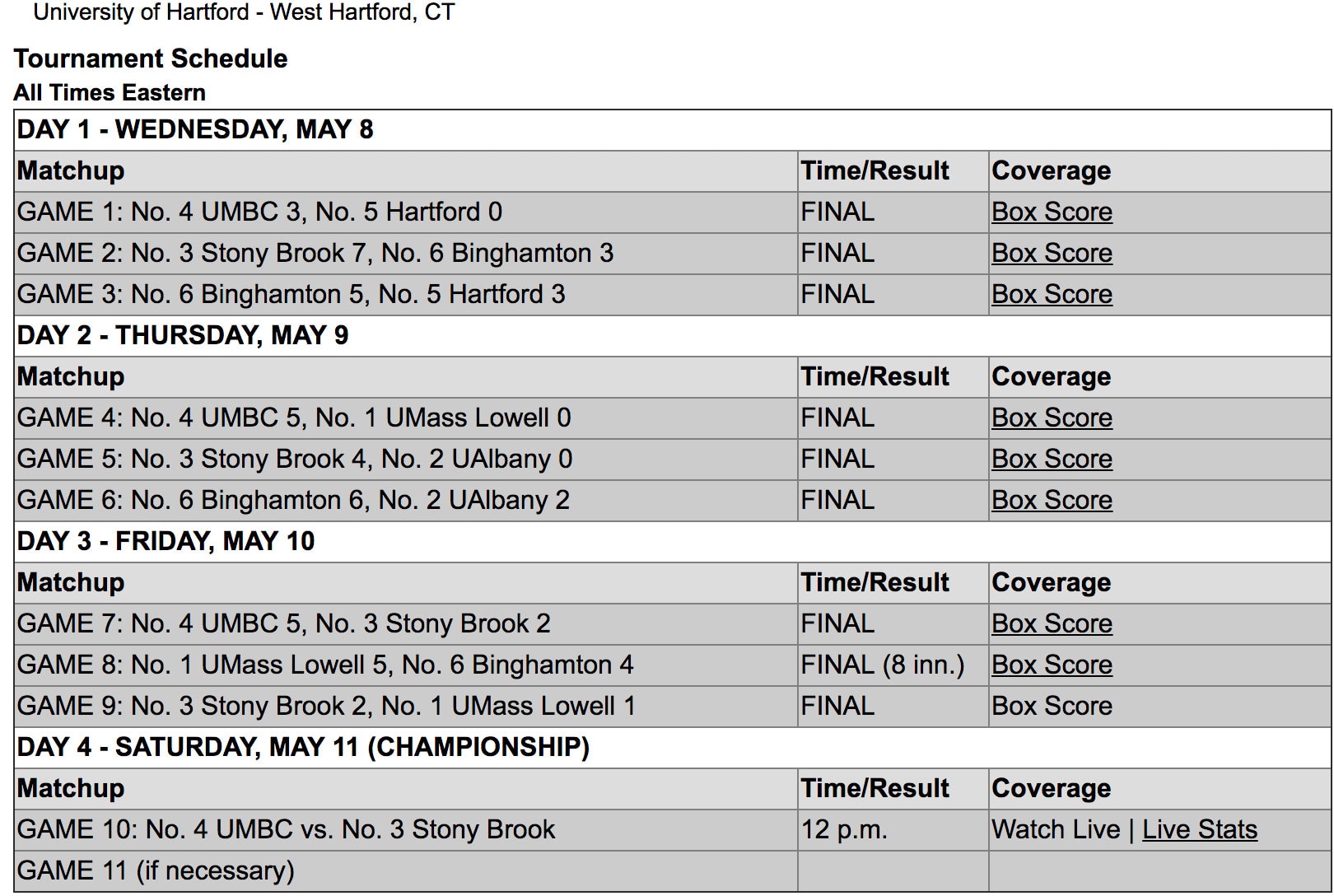 Due to rain in Amherst, the final game of the Championship has been canceled. No. 1 and No. 3 are named Co-Champions and Regular season champion Fordham receives the A-10 automatic bid to the NCAA Tournament.